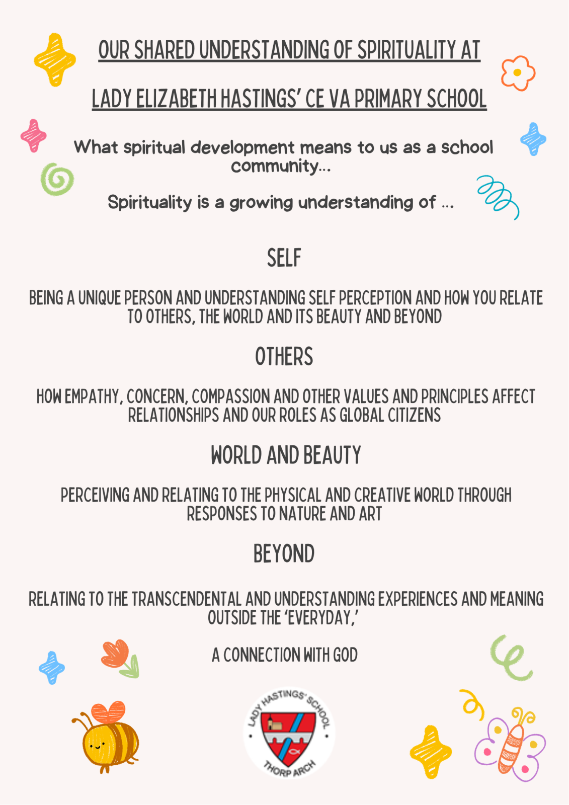 Spirituality is a difficult thing to define! At Lady Elizabeth Hastings' CE VA Primary School we believe it is fundamental to our mental and physical well-being (for children and adults too), but is not exactly the same as those things. It is not necessarily tied to a religious belief. People of faith and people of no faith can be deeply spiritual.